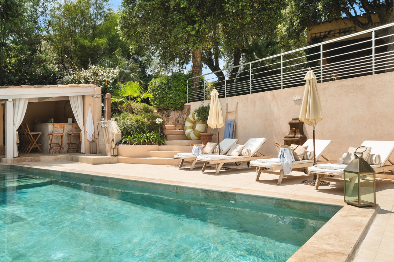 Il y a une piscine privée de 10m par 4m avec pool house et bar entouré d'une terrasse spacieuse avec 6 chaises longues.